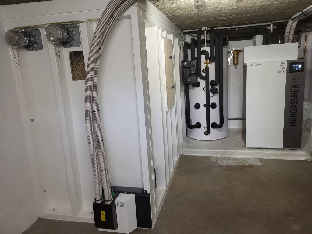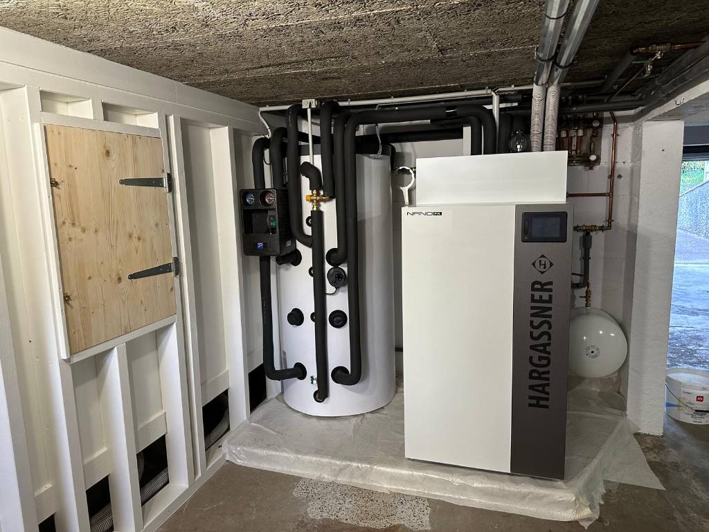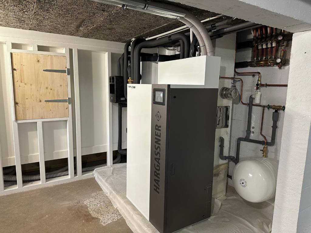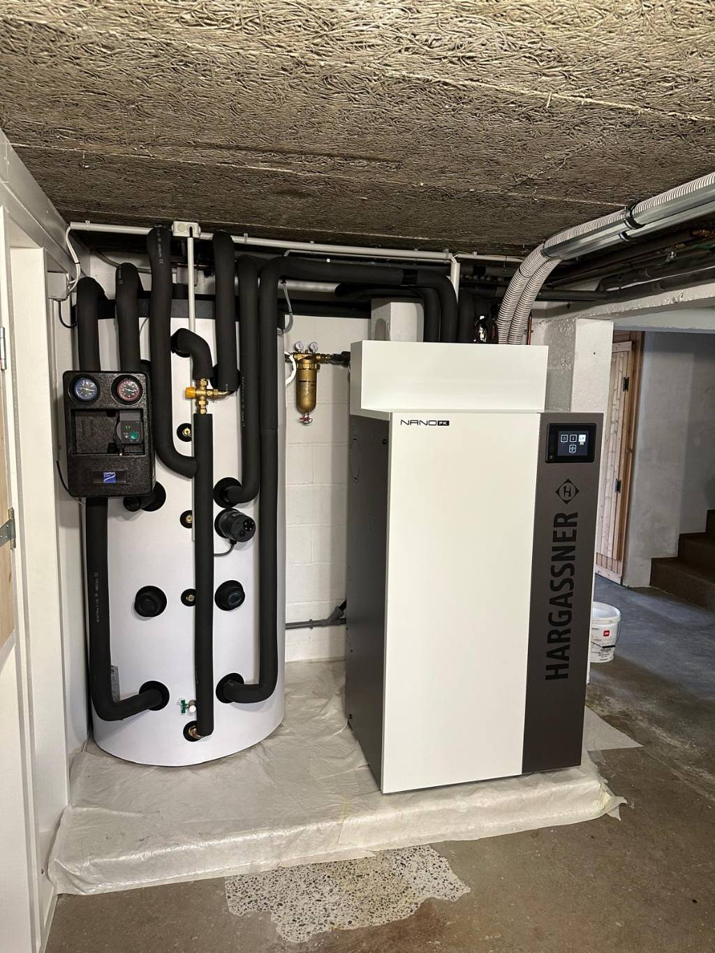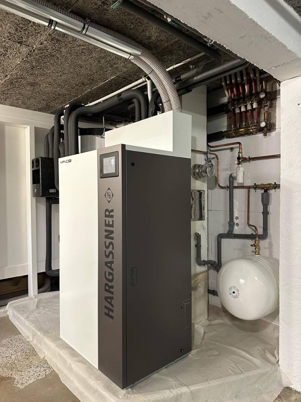 Après étude et discussion avec les clients sur leurs besoins et attentes, le choix s'est porté sur la chaudière à pellets très performante de marque HARGASSNER type Nano PK12kw. Cette chaudière, labellisée Flamme verte 7 étoiles (normes 303.5) A++, affiche une efficacité énergétique saisonnière (ETAS) de 82%.